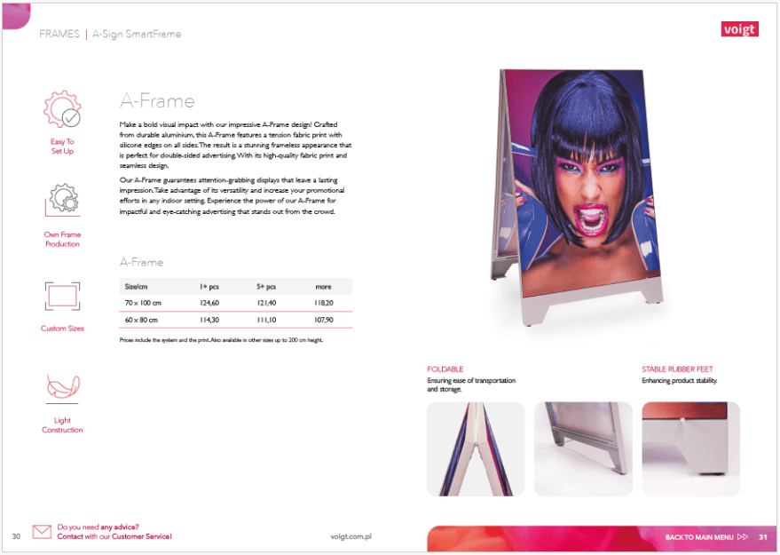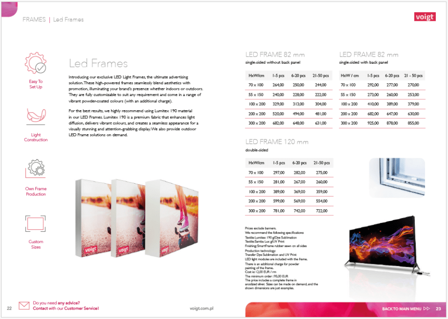 W styczniu 2025 roku rozpoczęłam współpracę z firmą Voigt Promotion, w ramach której projektuję dla nich nowy Price Book i ulotki. Moim zadaniem było stworzenie świeżego layoutu, dobranie odpowiednich fontów oraz kolorystyki, które odpowiadają wizerunkowi firmy. Kluczowym celem było zapewnienie przejrzystości i prostoty, aby użytkownicy mogli łatwo i wygodnie poruszać się po pliku. Stworzyłam projekt, który łączy estetykę z funkcjonalnością, zapewniając zarówno atrakcyjny wygląd, jak i intuicyjność na każdym etapie użytkowania.